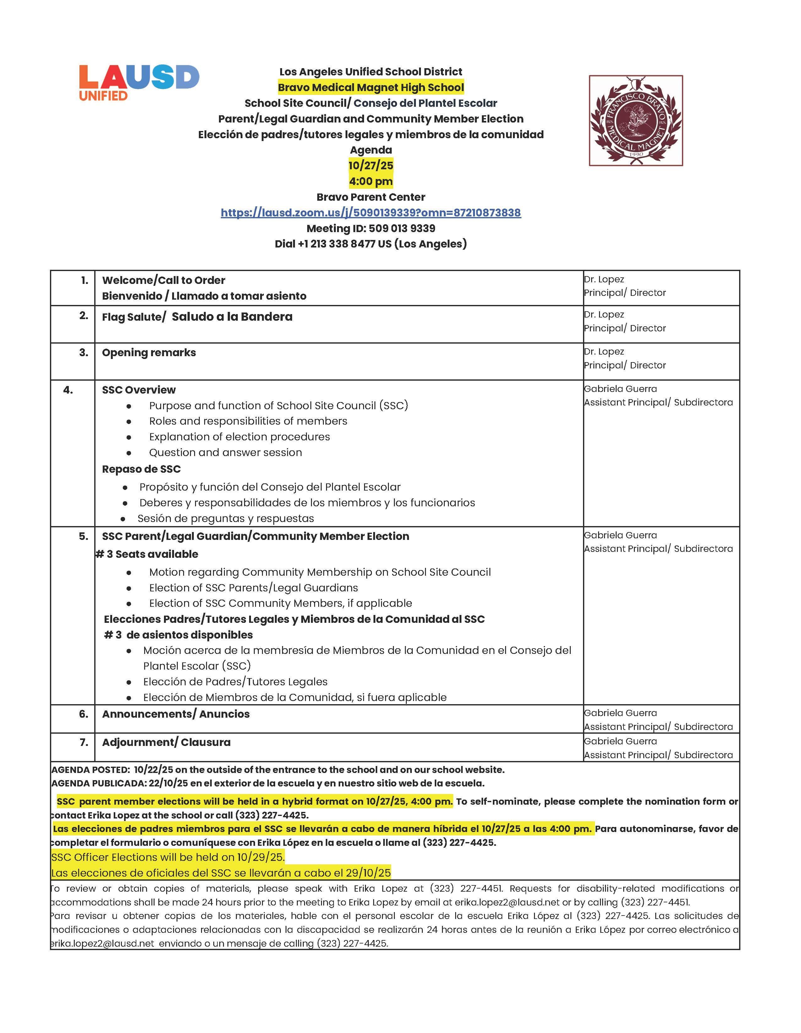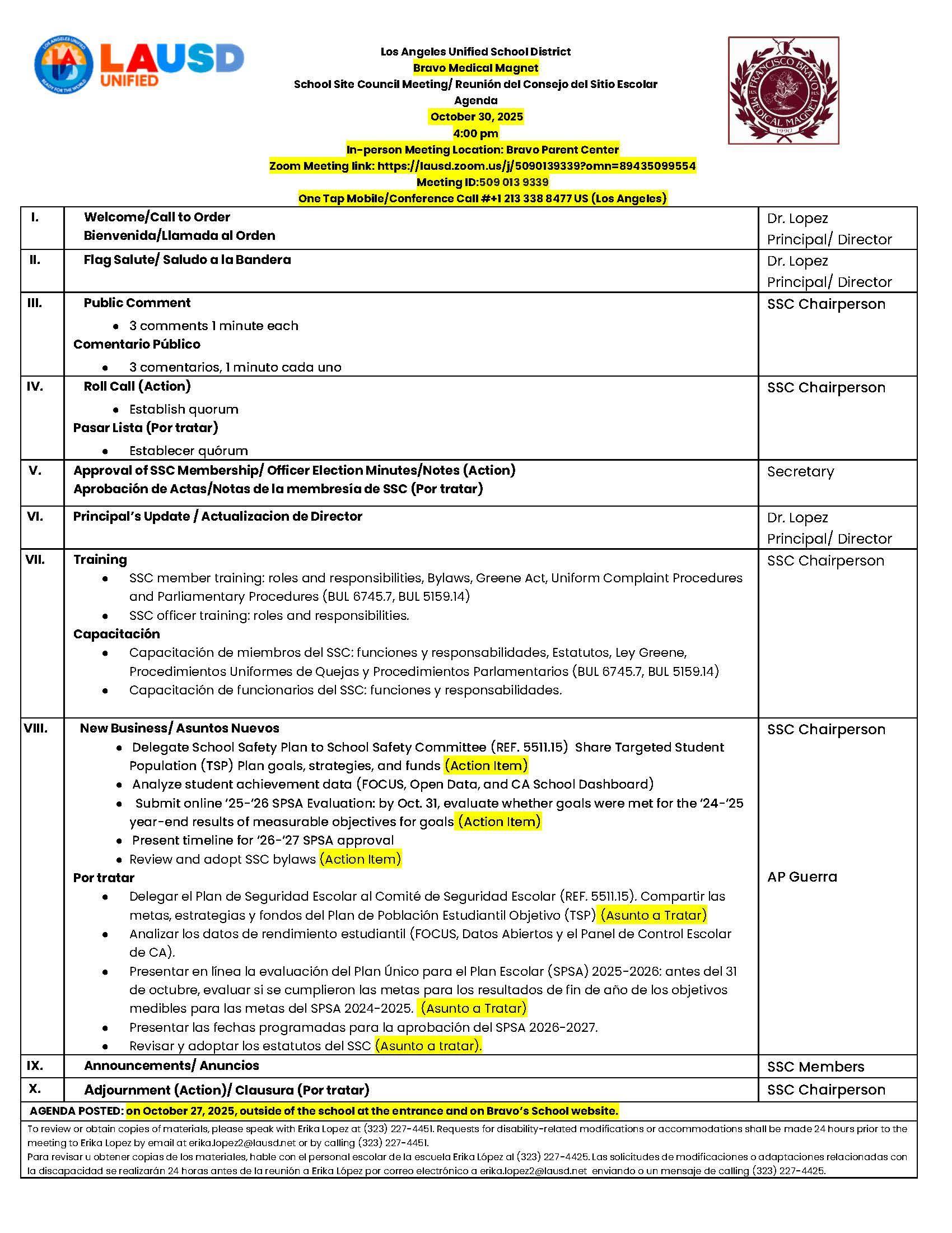Bravo Medical Magnet High School School Site Council/ Consejo del Plantel Escolar