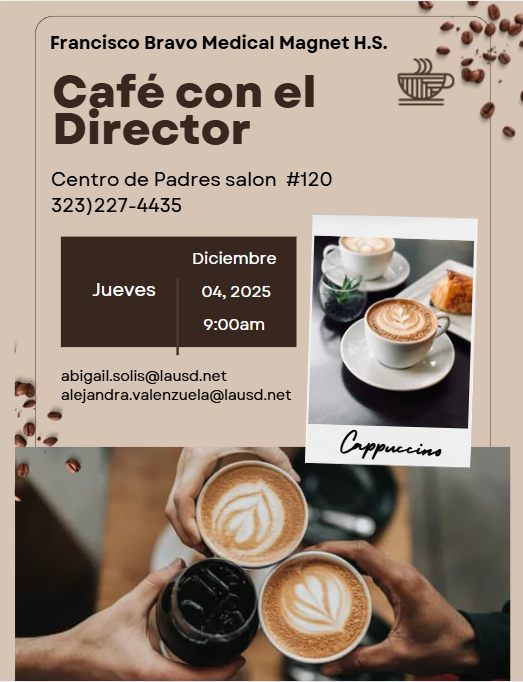 Coffee with the Principal/Cafe con el Director Join us for Coffee with the Principal Venga y unase con nosotros para el cafe con el director